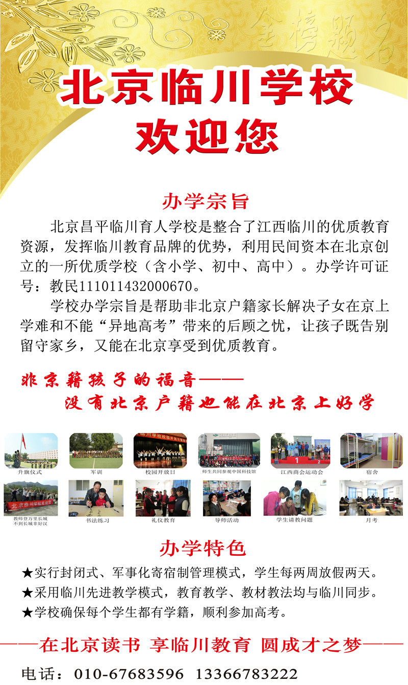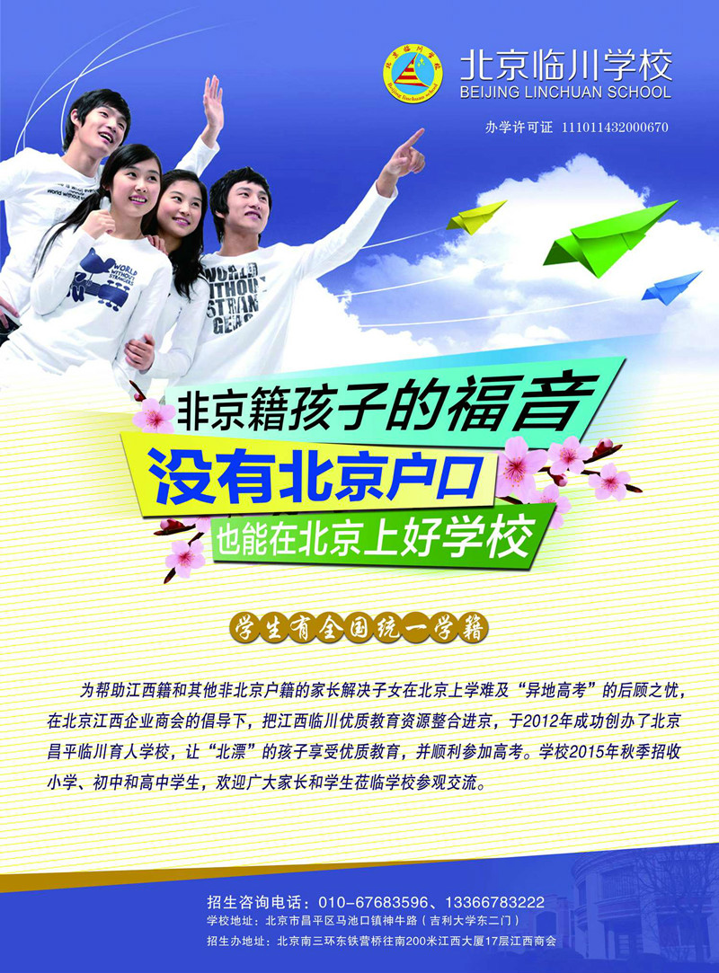 北京临川学校是整合了江西临川的优质教育资源,发挥临川教育品牌的优势,利用民间资本在北京创办的一所优质学校。该校于2012年在江西省人民政府驻北京办事处和 的倡导与支持下正式创立,旨在帮助江西籍及其他非京籍家长解决子女在北京上学难及不能“异地高考”的困扰,让孩子既告别留守家乡,又能在北京享受优质教育。